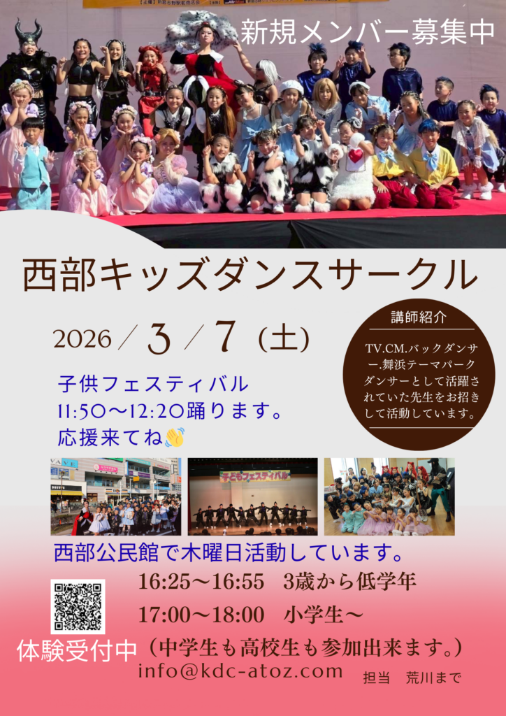 - コルフェス 2026年待ちに待ったコルフェスが今年もゴールデンウィークに開催されます♪ 『西部キッズダンスサークル』 5月6日(水)… 続きを読む: コルフェス 2026年